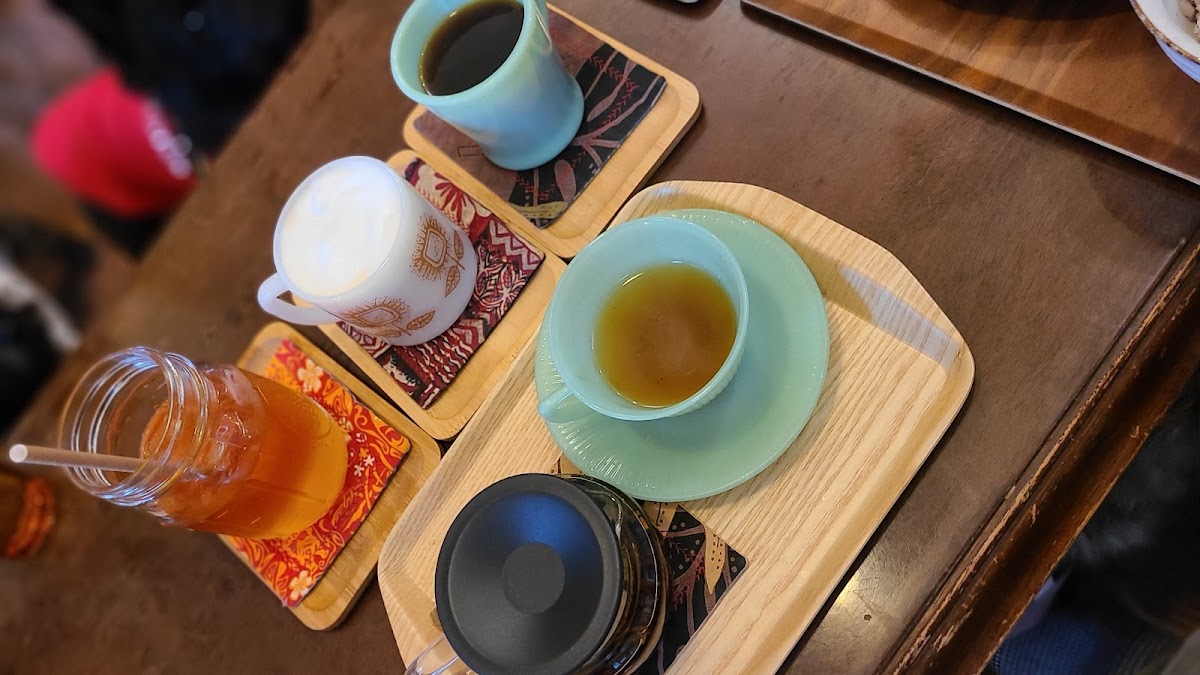 As you step inside, you’re greeted by the warmth of rustic wooden beams and a cozy atmosphere accentuated by thoughtfully curated decor, including vintage LP records and whimsical Hawaiian-inspired accents. The friendly ambiance is further enhanced by the inviting presence of their resident dog, Arri, who welcomes visitors with wagging tails and a friendly demeanor— perfect for dog lovers!
